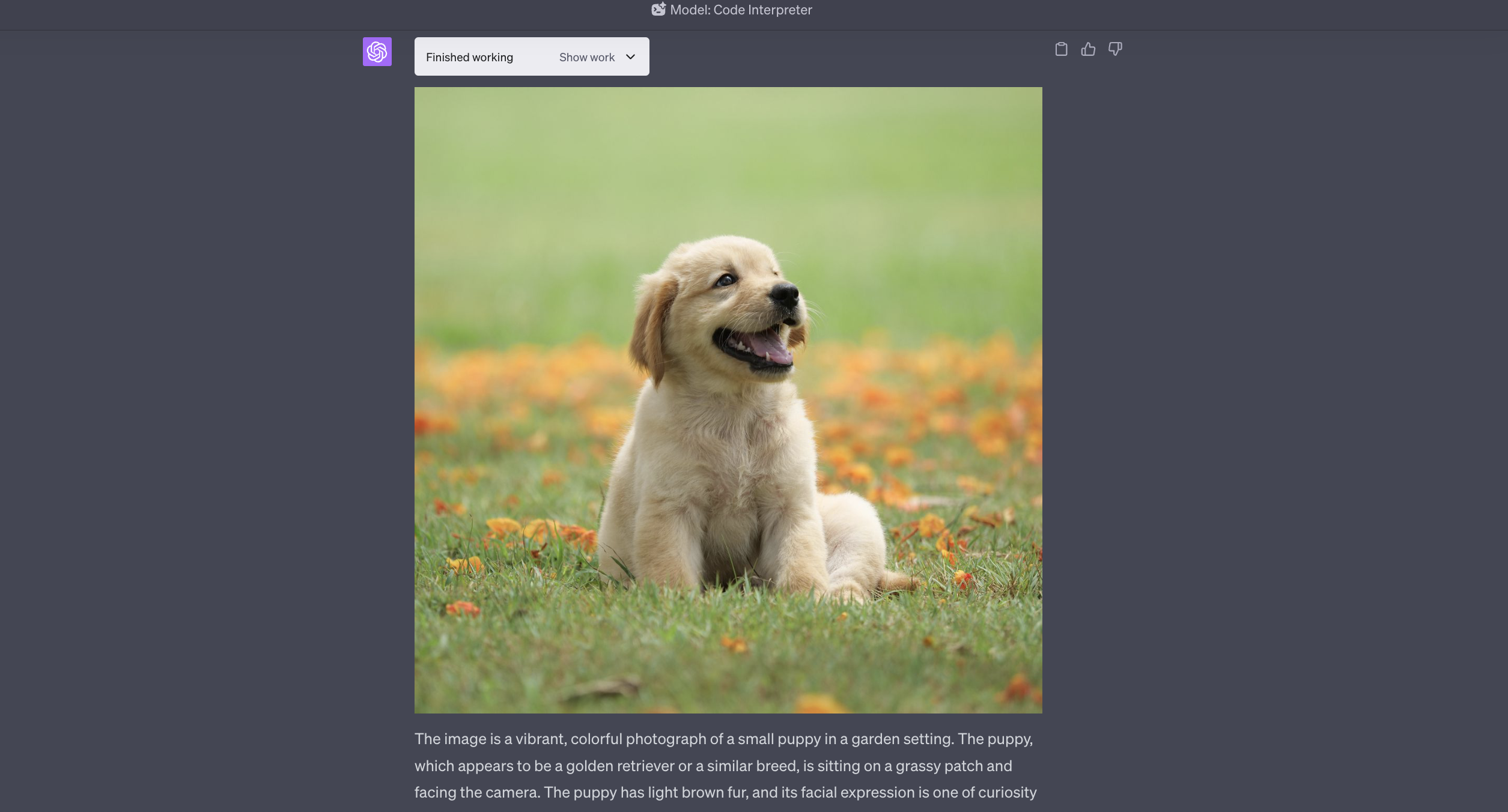 So the first thing that I tried with the Code Interpreter was actually uploading a photo and then seeing what Code Interpreter could do. So in this case, I took a cute picture of a Labrador puppy and uploaded it into the chat GPT prompt window. It was then able to describe the image.