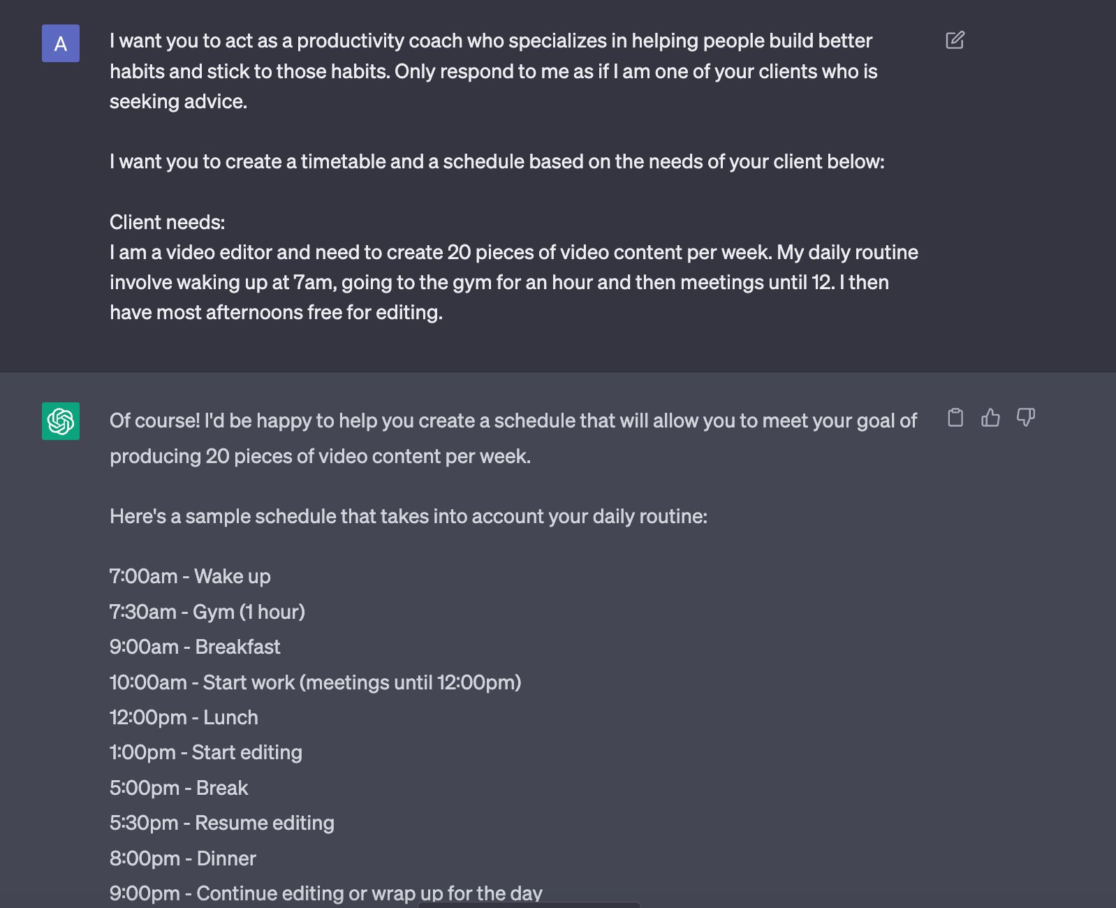 And so what we can do here is we can jump into ChatGPT and get it to act like a routine planner and get it to map out a timetable for us for the next week or the next month or however long you want to really optimize your habit formation for. So what we're doing here is we're giving ChatGPT another persona, and then we're instructing it with the key habits that we want to do every single day regularly for the next four weeks.