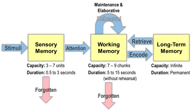 The premise of Information Processing Theory is that creating a long-term memory is something that happens in stages; first we perceive something through our sensory memory, which is everything we can see, hear, feel or taste in a given moment. In order for a sensory input to enter our short-term memory we have to deem it relevant and this is where attention comes in we have to pay attention; our short-term memory is what we use to remember things for very short periods, like a phone number; and long-term memory is stored permanently in our brains.