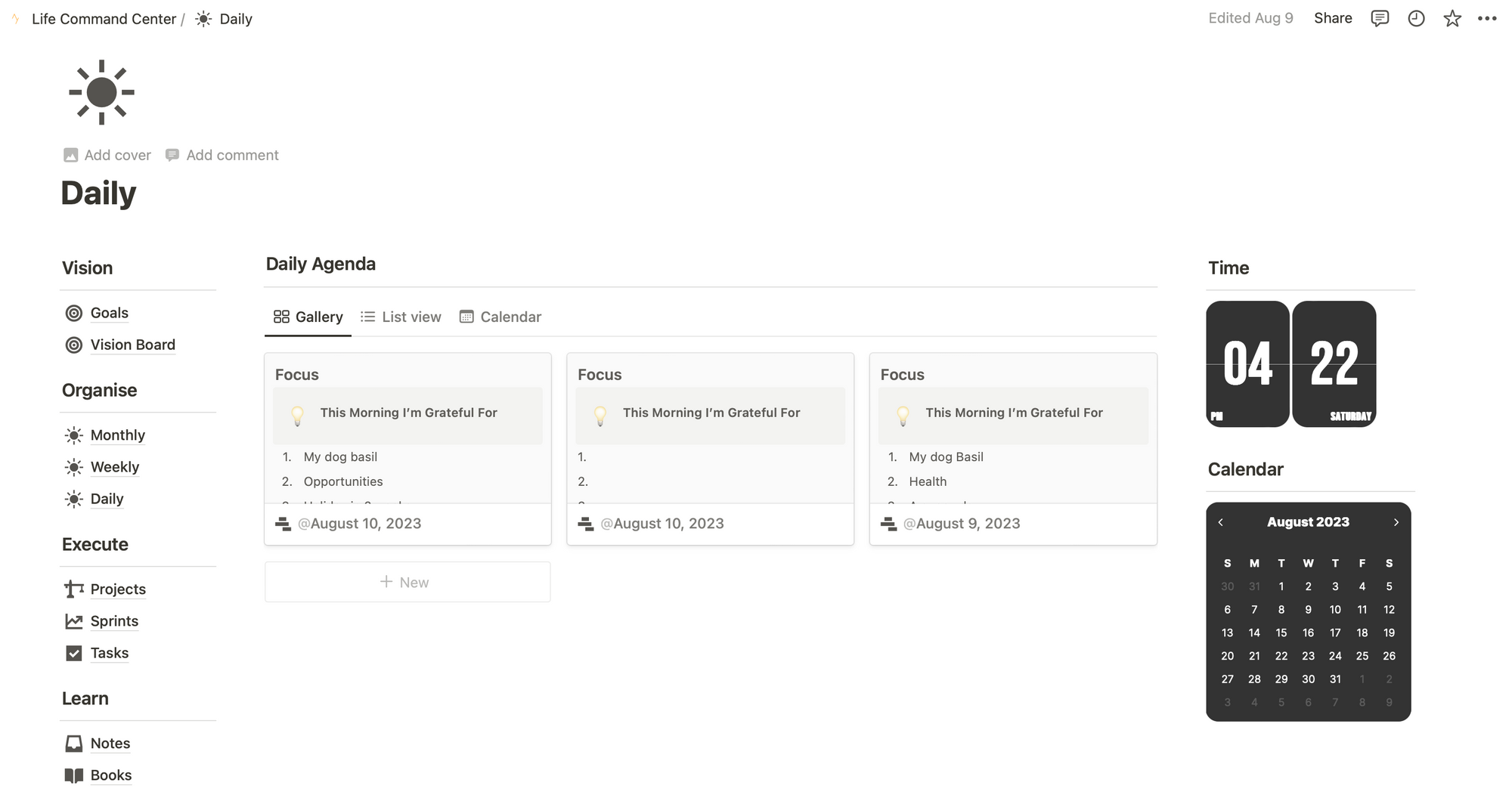My Life Command Center template is based on coaching and journaling principles, and asks me to think about three things I'm grateful for in the morning, one goal that I'm going to focus on to achieve that day, and then breaking that goal down into three smaller bite sized chunks.