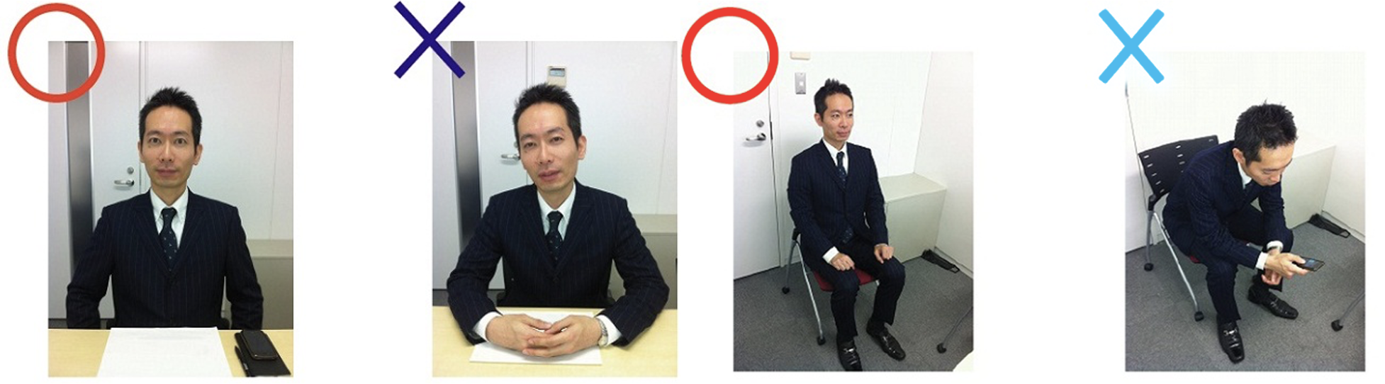 In terms of body language don't lean over the desk, sit up straight and adopt a neutral and open posture with your feet planted on the floor and legs uncrossed.