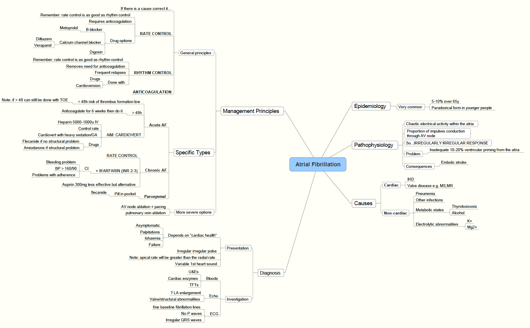 Before I walkthrough creating a mind-map with some pro tips here is, for example, what a basic mind map looks like. This is the one that I made for learning atrial fibrillation. Now my handwriting was so bad I actually mapped this out on computer whereas now I'd go for handwriting but this is a good one to show you some principles as you can actually read it.