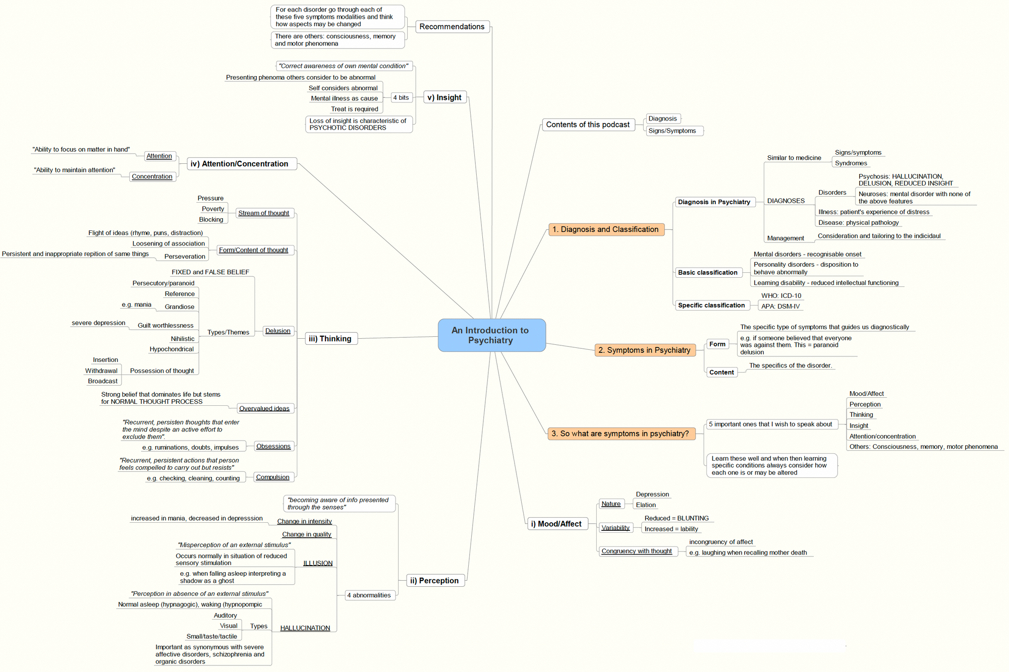 This is just one example of a mind map for a specific disease in medicine and you can use mind maps for anything. I especially like mapping out a course curriculum using a mindmap to help you structure how you are going to learn and so you know what to learn highlighting key topics or your weak areas. Here's one for example from a podcast I was obviously summazing focusing on the curriculum in psychiatry so maybe this was back in third year. This is much more expansive and helps to build structure going down into specific psychiatric conditions and symptoms.