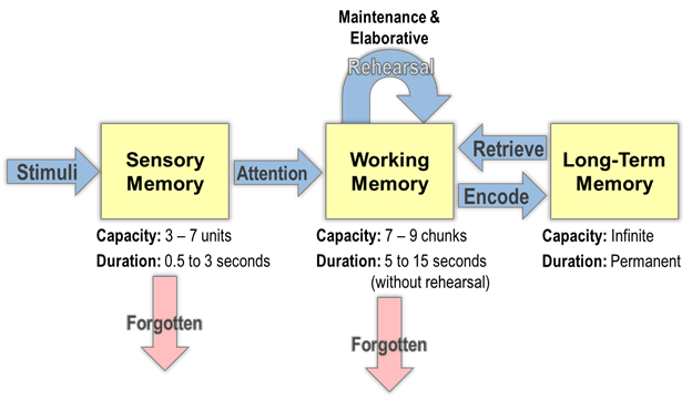 Information is filtered from our sensory memory into our short-term or working memory. From there, we process the information further. Some of the information we hold in our short-term memory is discarded or filtered away once again, and a portion of it is encoded or stored in our long-term memory.