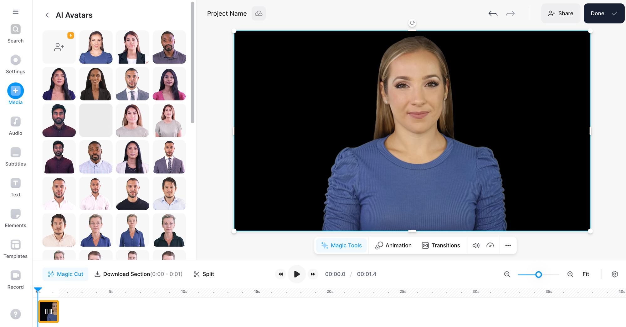 Unlike many of the other text to speech AI avatar tools on this list VEED is primarily a video editing platform and so you have access to a much wider choice of video editing tools like captions, animations and more powerful editing tools including re-sizing and exporting in a much wider range of formats and resolutions.