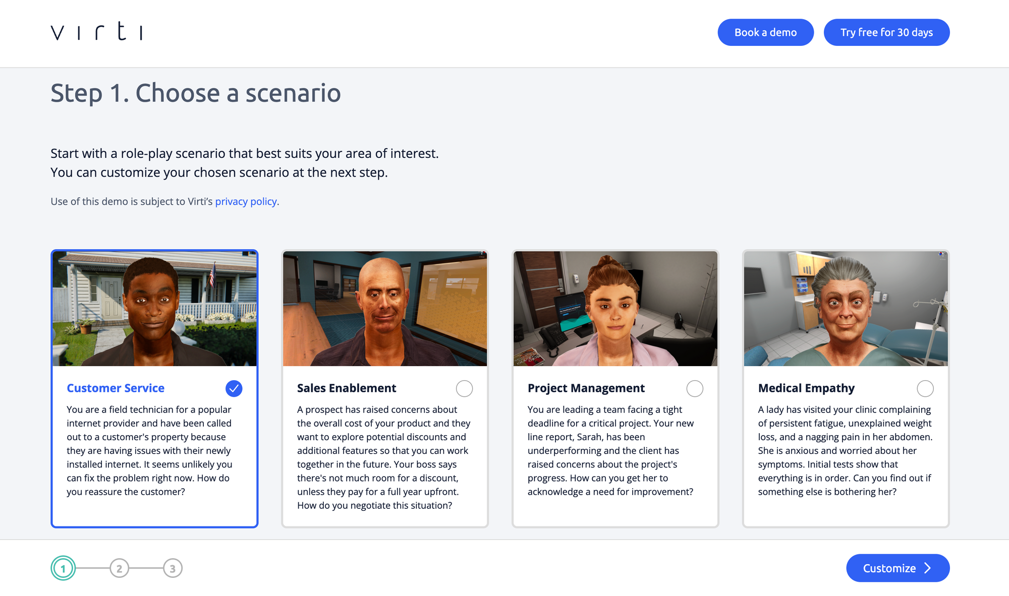 Virti's virtual human creator allows lots of customization and interaction with computer generated avatars and as Virti is focused on scenario based learning and soft-skills training like sales negotiation each of the interactive scenarios is mapped to an objective or learning outcome that needs to be achieved.